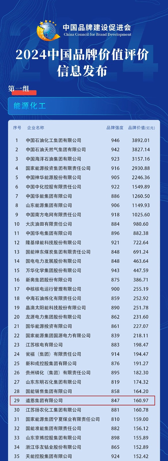 5月11日,第八個“中國品牌日”到來之際,2024中國品牌價值評價信息發布會在浙江德清召開,道恩集團的品牌價值達160.97億元,較去年增長10.3億元,品牌強度為847,再創歷史新高。據介紹,今年參加評價的品牌數量達到1034個,對其中775個品牌進行了品牌價值評價信息發布,平均品牌價值增長21億元。