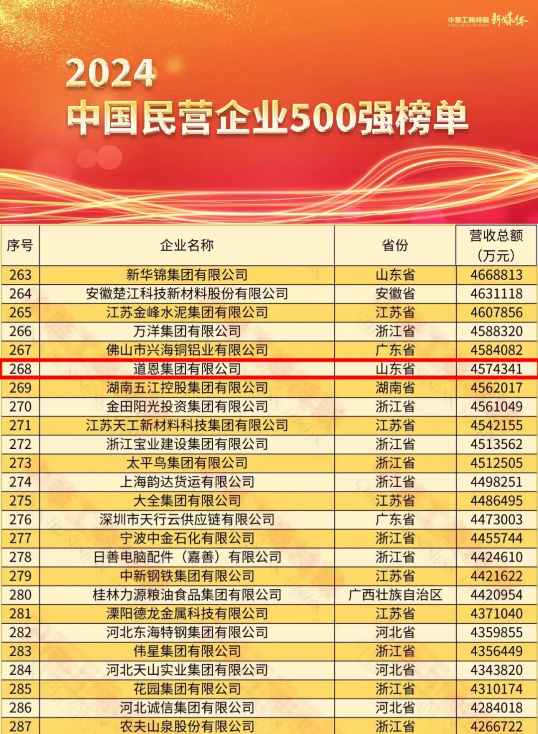 10月12日下午,2024中國民營企業500強發布會暨全國優強民企隴上行在甘肅省蘭州市舉行,道恩集團憑借457.4億元的營業收入位列268名,較去年躍升27個位次。此前的9月23日,在黑龍江省哈爾濱市舉行的全國民營企業科技創新與標準創新大會上,發布的“2024民營企業發明專利500家榜單”顯示,道恩集團和道恩股份分列第252位和第447位,展示了企業蓬勃向上的經營實力、科研能力和新質生產力。