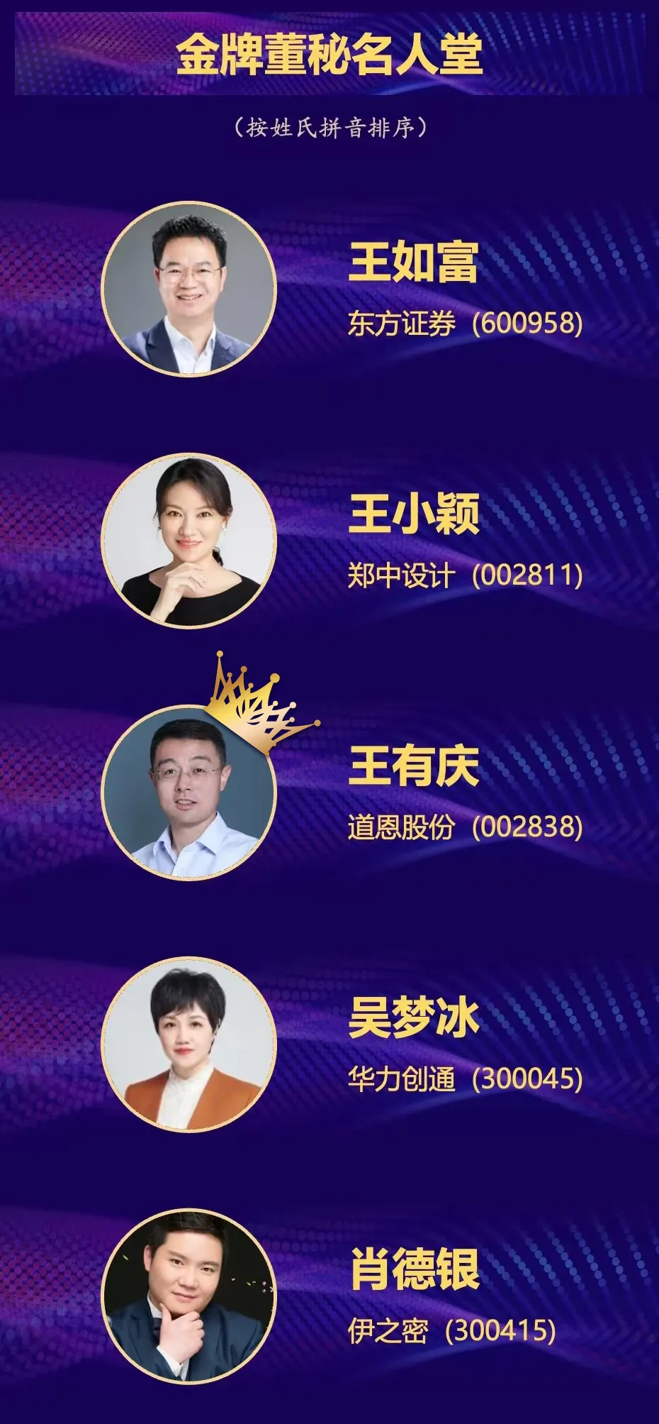 據介紹,金牌董秘評選活動的評價主體由監管機構、證券分析師、投資者和財經媒體等專業人士組成,評審程序嚴格規范,旨在促進上市公司治理結構優化,推動中國資本市場的健康發展。根據評選規則,只有五屆蟬聯或者累計獲得七屆并在近五年內蟬聯三屆獲得“金牌董秘”稱號的董事會秘書,才有資格新晉“金牌董秘名人堂”。