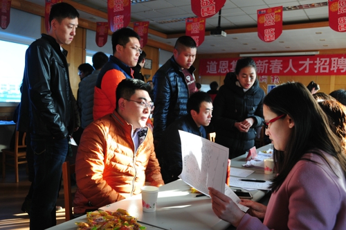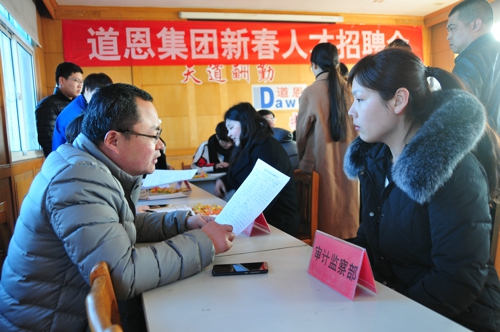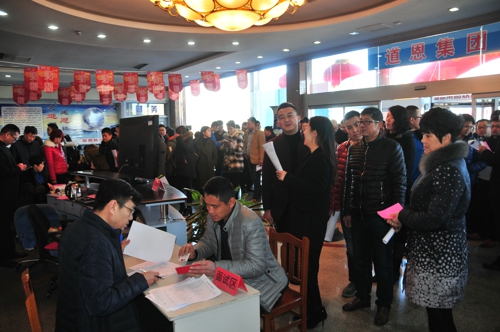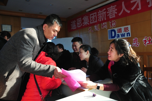 是日早上不到8點,道恩集團總部一樓大廳的招聘現場人潮涌動。筆者看到,雖然現場人氣火爆但井然有序,從填寫檔案、綜合面試,各環節層層把關,工作人員耐心地講解公司人才管理制度,應聘人員積極展示自己的競爭優勢。