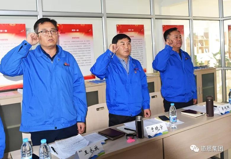 王永放書記首先宣讀了新一屆黨總支委員會名單,經(jīng)黨總支及各黨支部召開黨員大會選舉,由道恩集團(tuán)總裁索延輝擔(dān)任新一屆黨總支書記,副總裁王永放擔(dān)任黨總支副書記。隨后,全體黨員面向鮮紅的黨旗,重溫當(dāng)年入黨時向黨作出的莊嚴(yán)承諾。
