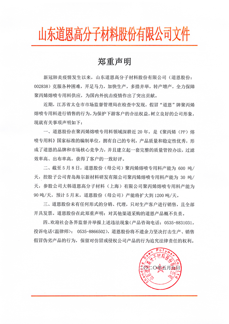 近期,江蘇省太倉(cāng)市市場(chǎng)監(jiān)督管理局在檢查中發(fā)現(xiàn)假冒“道恩”牌聚丙烯熔噴專(zhuān)用料進(jìn)行銷(xiāo)售的行為,為保護(hù)下游客戶(hù)的合法權(quán)益,樹(shù)立良好的公司形象,現(xiàn)就有關(guān)事項(xiàng)聲明如下: