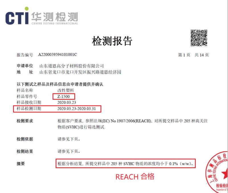 “經過有害物質注冊、評估、檢驗后,在測試清單中205項有害物質含量中均符合REACH的標準。這一突破性成果表明,道恩的產品在化學物質指標上達到了歐盟市場的要求。”田洪池總經理說,此舉將有助于拓展國際市場,提升道恩品牌國際化水平。