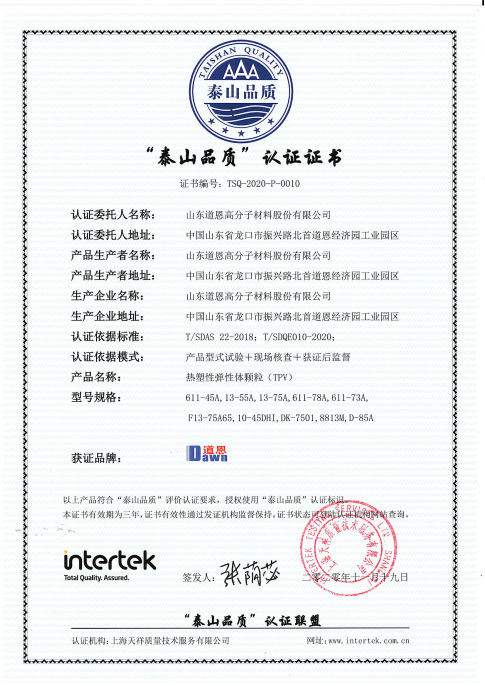 日前,道恩股份“熱塑性彈性體(TPV)”產(chǎn)品通過(guò)“泰山品質(zhì)”認(rèn)證, 成為“代表山東制造”的高端品牌。同時(shí),在剛剛結(jié)束的2020年度山東知名品牌認(rèn)定工作中,道恩股份聚丙烯(PP)熔噴專用料、道恩鈦業(yè)公司二氧化鈦顏料(金紅石型鈦白粉)被認(rèn)定為山東知名品牌(產(chǎn)品)。由此看出,道恩產(chǎn)品的品質(zhì)越來(lái)越高端,道恩品牌影響力越來(lái)越大。