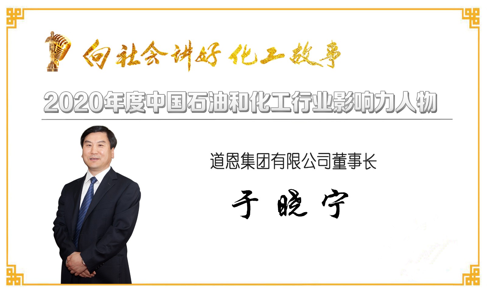在給于曉寧董事長的頒獎詞說,“他,是全國石油和化學工業勞動模范,歷經30載風雨,帶領一個5人小商場,成長為中國民營企業500強;他,是化工新材料產業創新發展的踐行者,堅持世界眼光、國際標準,以高質量發展爭當新舊動能轉換的排頭兵,躋身全球化競爭的大舞臺。”