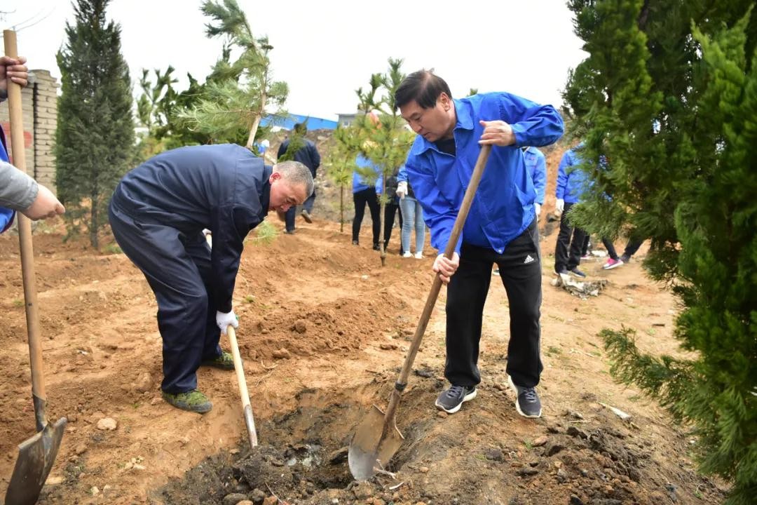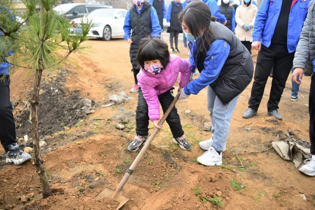 上午8時許,在位于龍口市新材料新能源產業園北皂路的植樹地點,數百名干部員工積極投身植樹活動。于曉寧董事長與大家一起拿起鐵锨、挖坑植苗,鏟土入坑、培實新土、修整樹盆,活動現場一派熱火朝天的勞動景象??上驳氖牵矘潢犖橹谐霈F了“小道恩人”,他們在大人的指導下拿起鏟子為樹苗培新土,從小培養環保意識和生態理念。