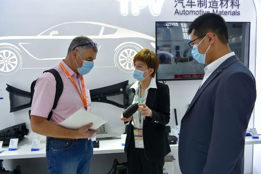道恩展位上,電子屏滾動播放著反映企業(yè)發(fā)展歷程、戰(zhàn)略目標(biāo)、科技研發(fā)、產(chǎn)品性能以及硬核抗疫等情況的視頻。參展人員熱情接待,詳細(xì)解答來訪客戶問題,充分介紹了道恩產(chǎn)品的優(yōu)越性能。國內(nèi)外知名展商慕名前往道恩展臺溝通洽談,其中不乏中煤集團(tuán)、威高集團(tuán)、海南逸盛、利安德巴塞爾、曼胡默爾、中國一汽、TCL、正泰電子、李寧等知名客戶。
