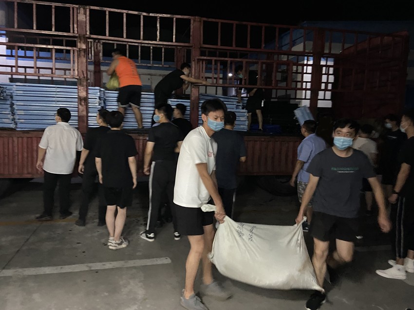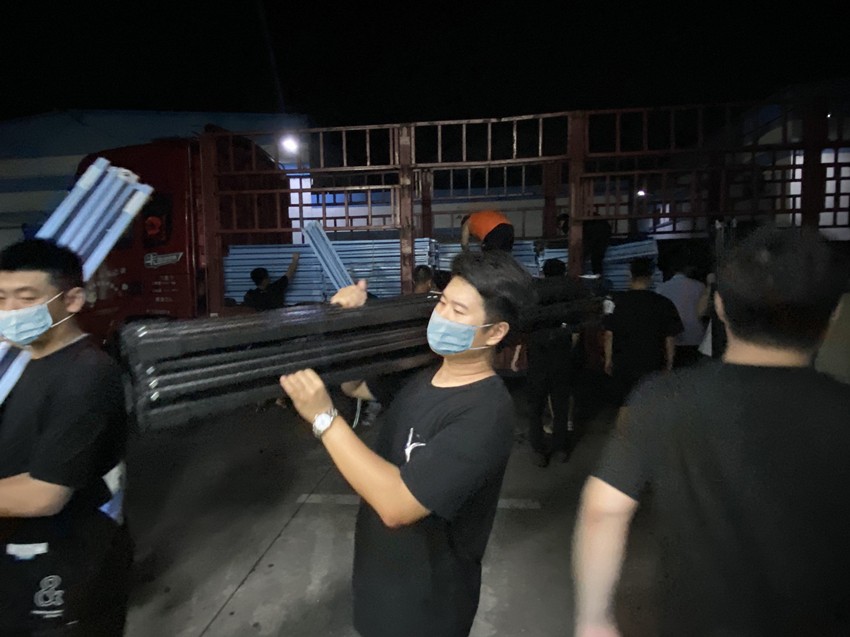 8月5日晚22時,運載遮陽棚的貨車駛入道恩集團總部駐地。一聲號令,行政管理部與道恩化學干部員工緊急集結,加班加點接卸防疫物資。黑夜中,每一個腳步都堅實有力,每一次搬運都傳遞著愛心。大家爭分奪秒,再一次用行動詮釋了“道恩速度”。