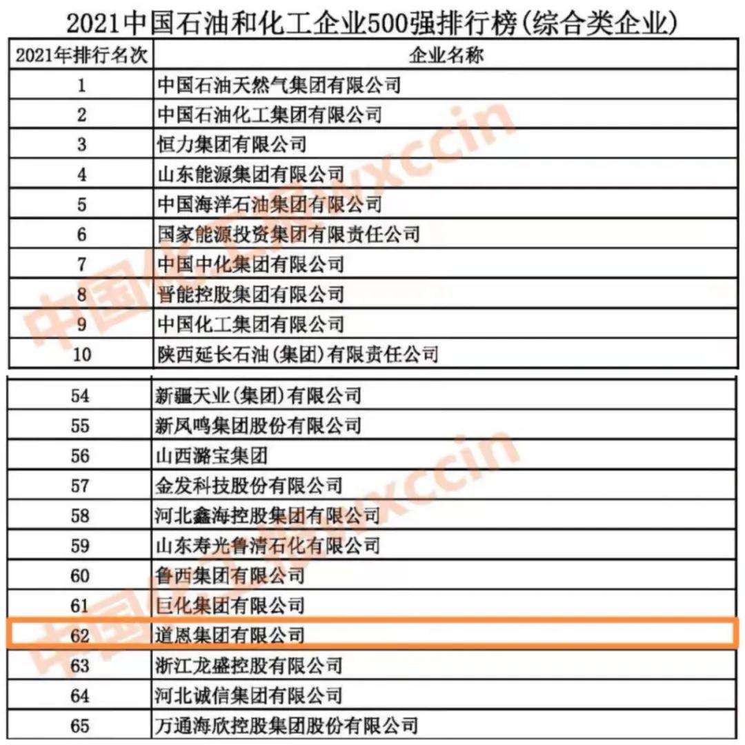 11月29日,2021中國石油和化工企業(yè) 500強發(fā)布會暨雙循環(huán)新格局下石油化工大企業(yè)的機遇與挑戰(zhàn)高峰論壇在線上召開。會上發(fā)布了2021中國石油和化工企業(yè)500強排行榜,道恩集團位列綜合類企業(yè)第62位,較去年上升19名,核心競爭力進一步增強,彰顯了強勁的高質量發(fā)展勢頭。