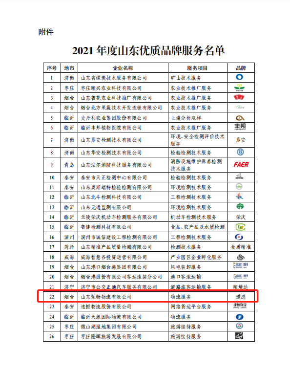12月20日,2021年山東知名品牌認定名單正式公布,道恩集團旗下山東榮暢物流有限公司的“道恩”品牌“物流服務”項目入圍“山東優(yōu)質品牌服務名單”。這是繼2019年獲得“山東知名品牌”以來,該公司再次獲評品牌榮譽,進一步彰顯了道恩品牌影響力。