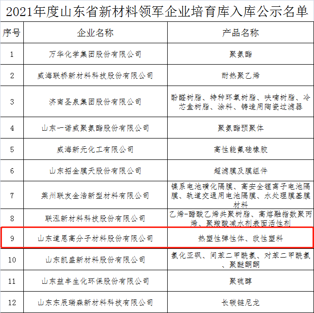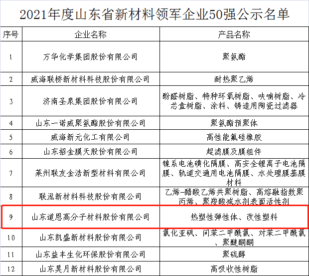 日前,2021年度山東省新材料領軍企業培育庫入庫名單和2021年山東省新材料領軍企業50強名單出爐。道恩股份的熱塑性彈性體、改性塑料入圍上述榜單。