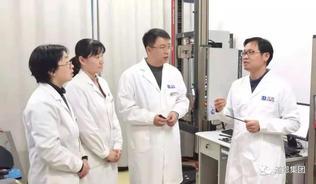 國家重點人才工程專家、道恩股份總經理田洪池(右1)在技術中心指導工作