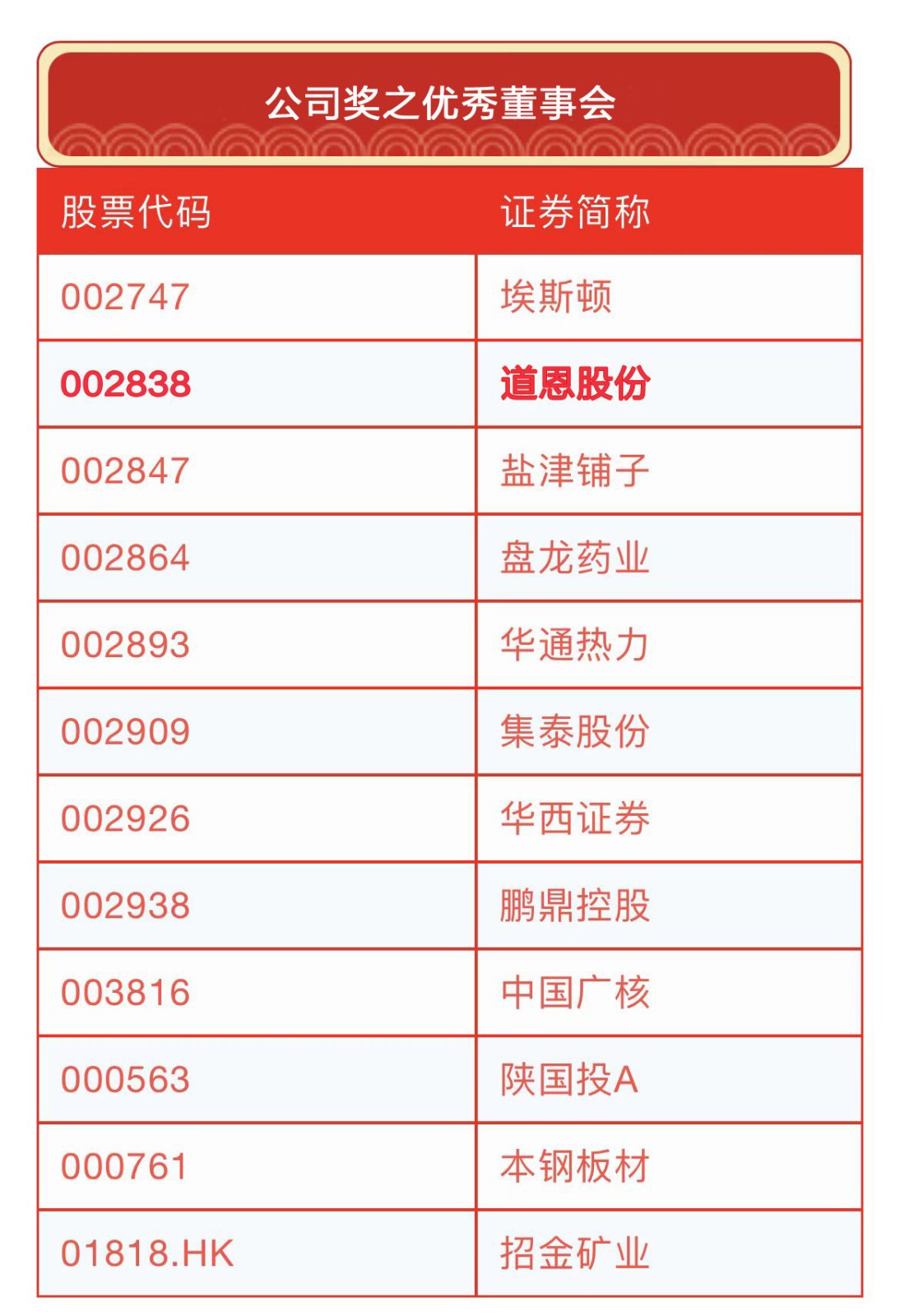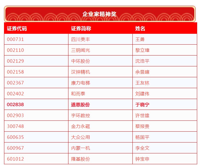 4月6日,第十七屆中國上市公司董事會“金圓桌獎”獲獎名單公布,道恩股份榮膺“優秀董事會”,道恩股份董事長于曉寧榮獲“企業家精神獎”。
