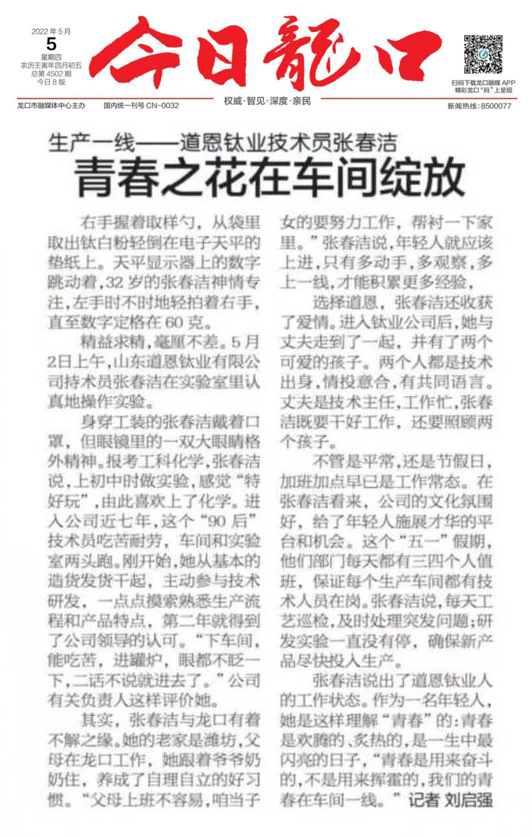 張春潔說出了道恩鈦業(yè)人的工作狀態(tài)。作為一名年輕人,她是這樣理解“青春”的:青春是歡騰的、炙熱的,是一生中最閃亮的日子,“青春是用來奮斗的,不是用來揮霍的,我們的青春在一線。”