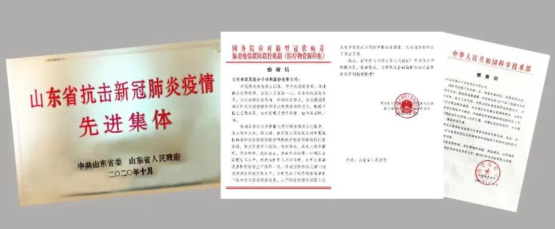 疫情期間,于曉寧董事長帶領道恩人第一時間投身防疫物資的生產保供和研發技術攻關,最大限度保障口罩布聚丙烯熔噴專用料供應。同時,與北京化工大學聯合承擔了國家科技部和北京市科委兩項應急研究課題,參與起草《可重復使用民用口罩團體標準》,極大緩解了疫情之下國家急需可反復使用口罩的迫切需求。道恩硬核的抗疫表現,獲得了國務院、國家科技部及多個省份的感謝與表彰。