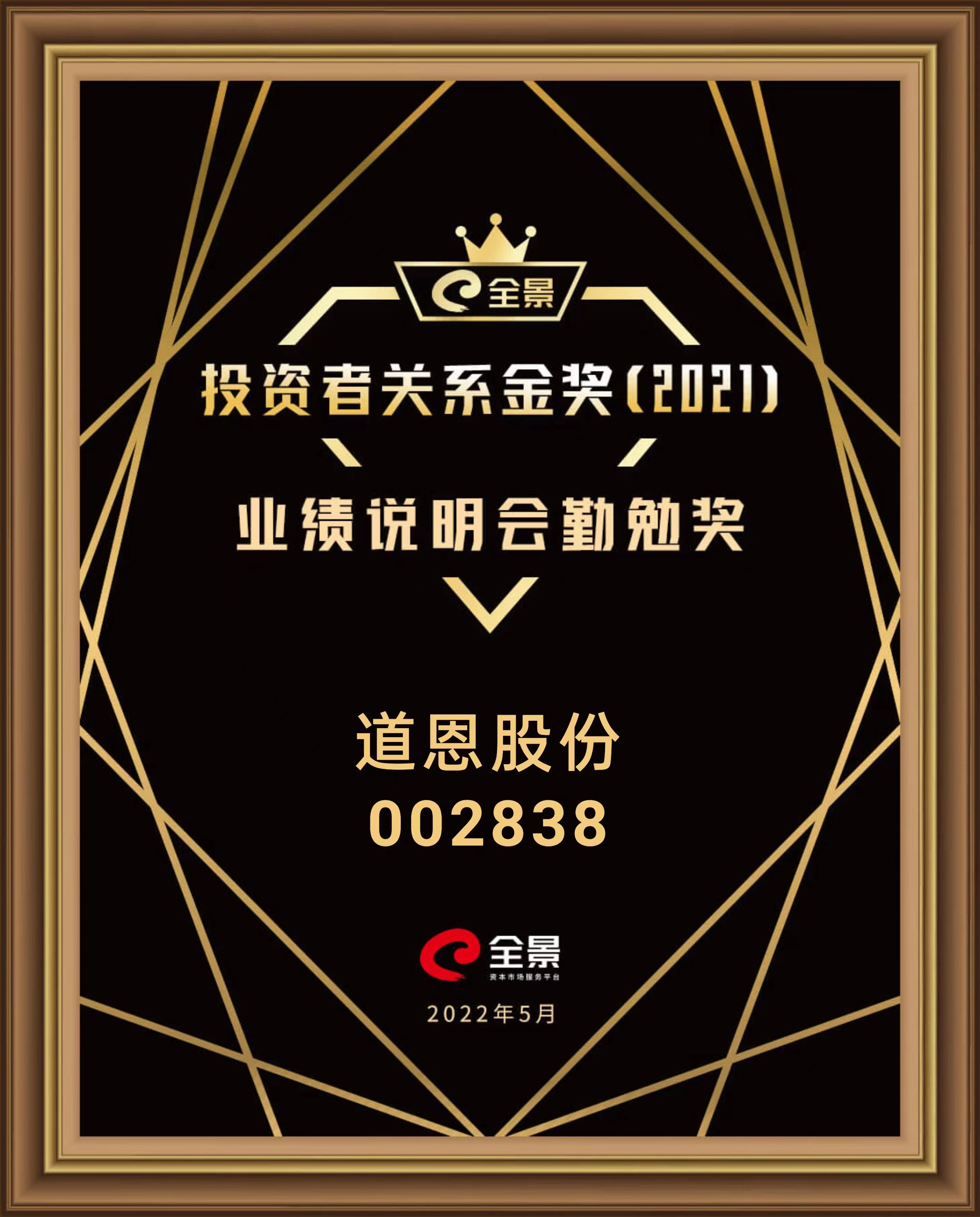 近日,“全景投資者關系金獎(2021)”獲獎榜單正式揭曉,道恩股份榮獲“業績說明會勤勉獎”。