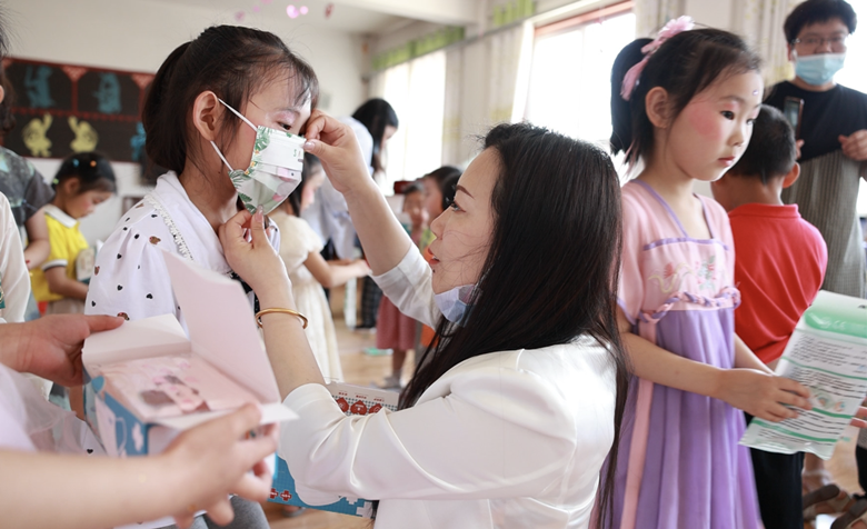 收到精美的節日禮物,孩子們的臉上洋溢著幸福的笑容。模塑公司自主生產的兒童款口罩,款式多樣,形象卡通,深受大家喜愛。綠色的小象、粉色的Hello kitty、彩虹條、小猴子……孩子們迫不及待地戴上口罩,眼神中滿是驚喜與快樂。