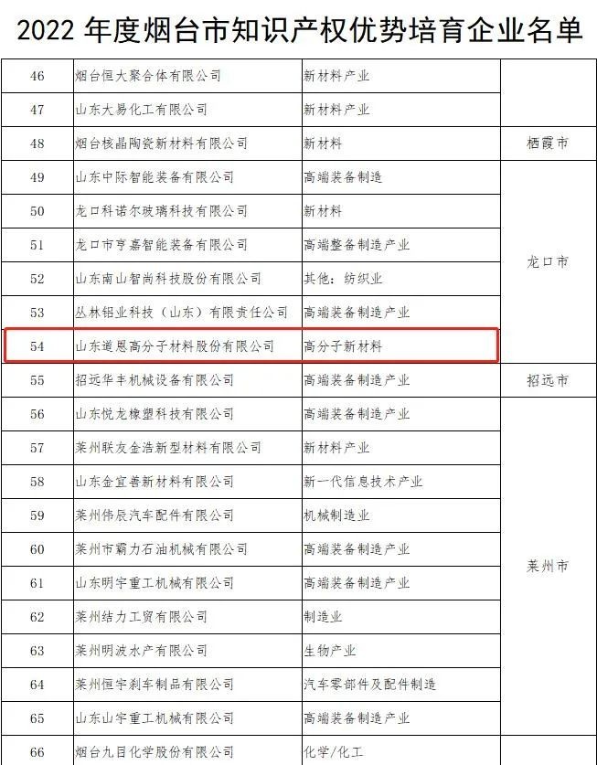 8月17日,煙臺市市場監(jiān)督管理局公布2022年度煙臺市知識產權優(yōu)勢培育企業(yè)名單,道恩股份名列其中。這是對道恩知識產權保護和培育工作的肯定,成為高質量發(fā)展新引擎,有利于全面提升企業(yè)自主創(chuàng)新能力和核心競爭力。