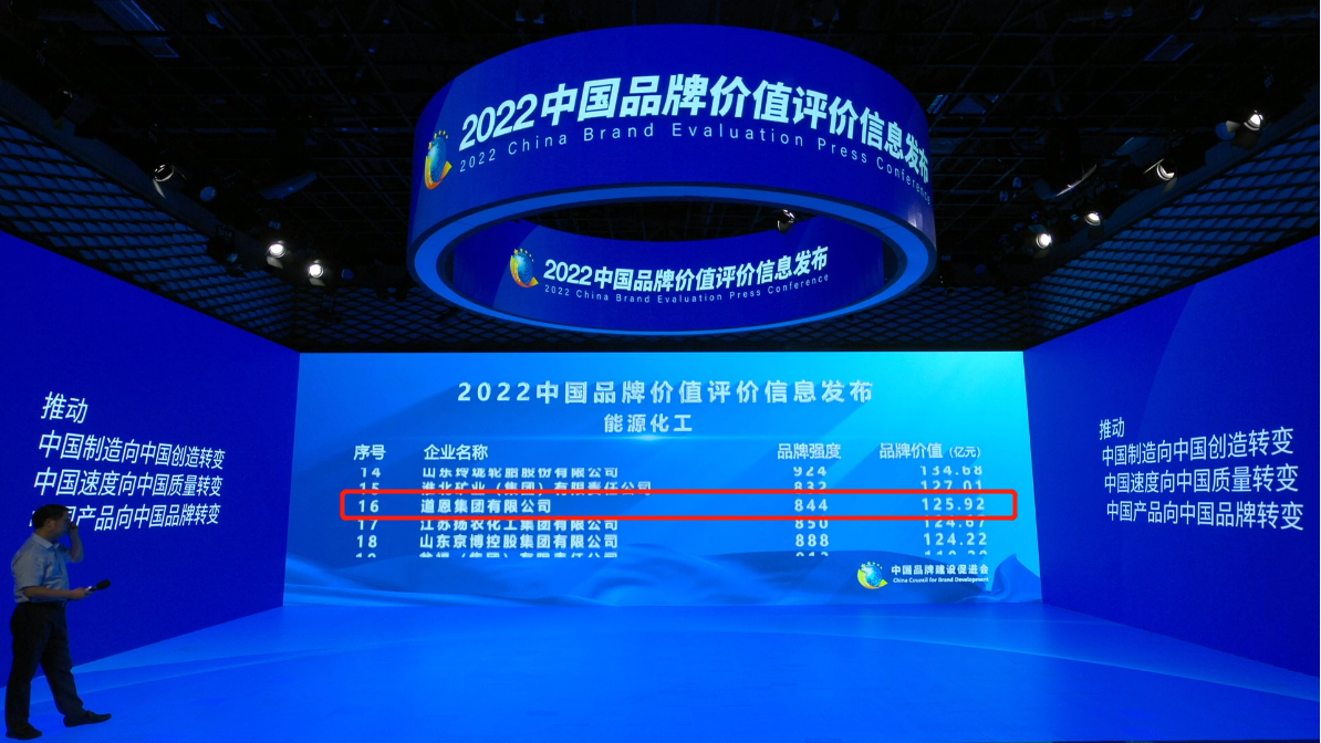 9月5日,中國品牌建設促進會、中國資產評估協會、新華社民族品牌工程辦公室等單位在京聯合發布“2022中國品牌價值評價信息”。集團公司以125.92億元的品牌價值,844的品牌強度,名列能源化工領域第16位,再創歷史新高,彰顯了道恩品牌的知名度、美譽度和影響力。