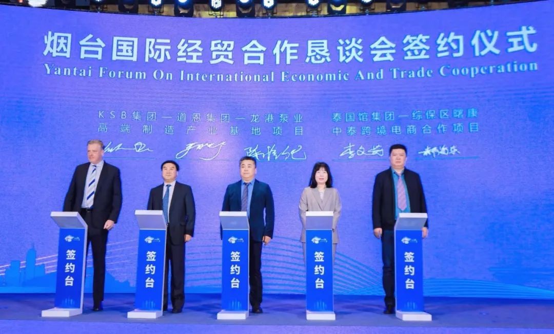 道恩集團董事長、總裁于曉寧,德國凱士比集團全球石化板塊總裁霍夫曼,龍港股份董事長陳培倫簽署合作協議,煙臺市、龍口市領導,世界500強企業(yè)、跨國公司代表,有關商協組織、重點采購企業(yè)負責人及新聞媒體記者共同見證簽約儀式。