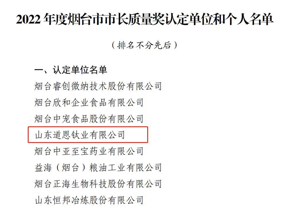 “鈦”精彩,高質量! 道恩再添一家煙臺市市長質量獎企業