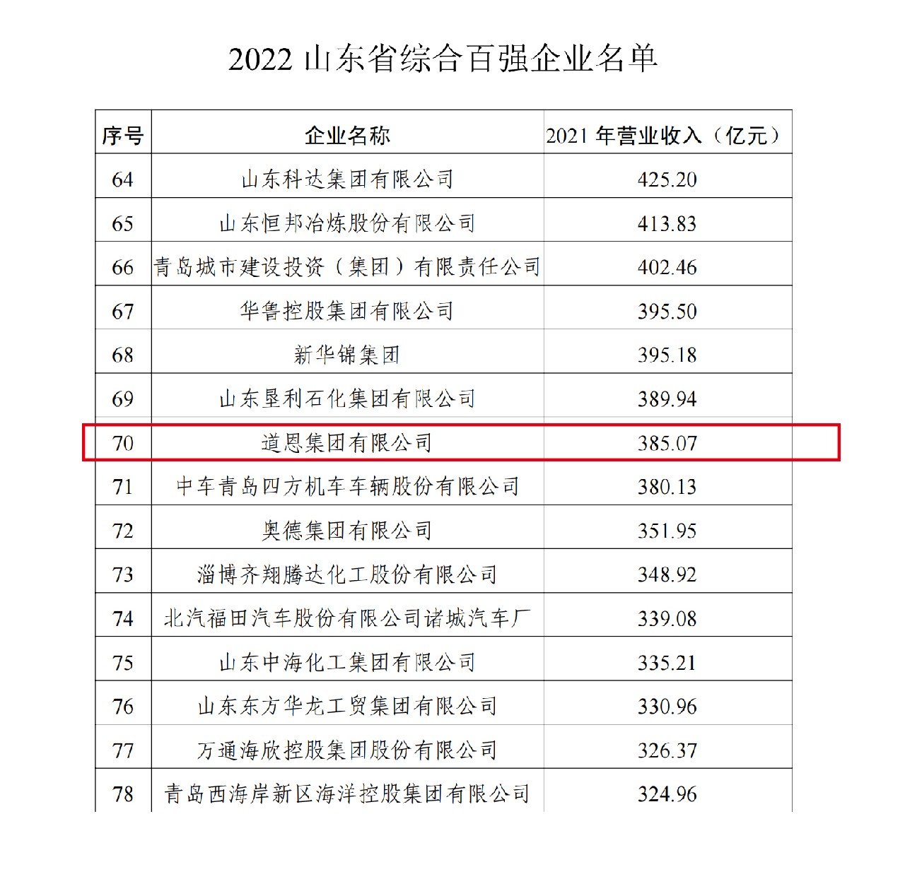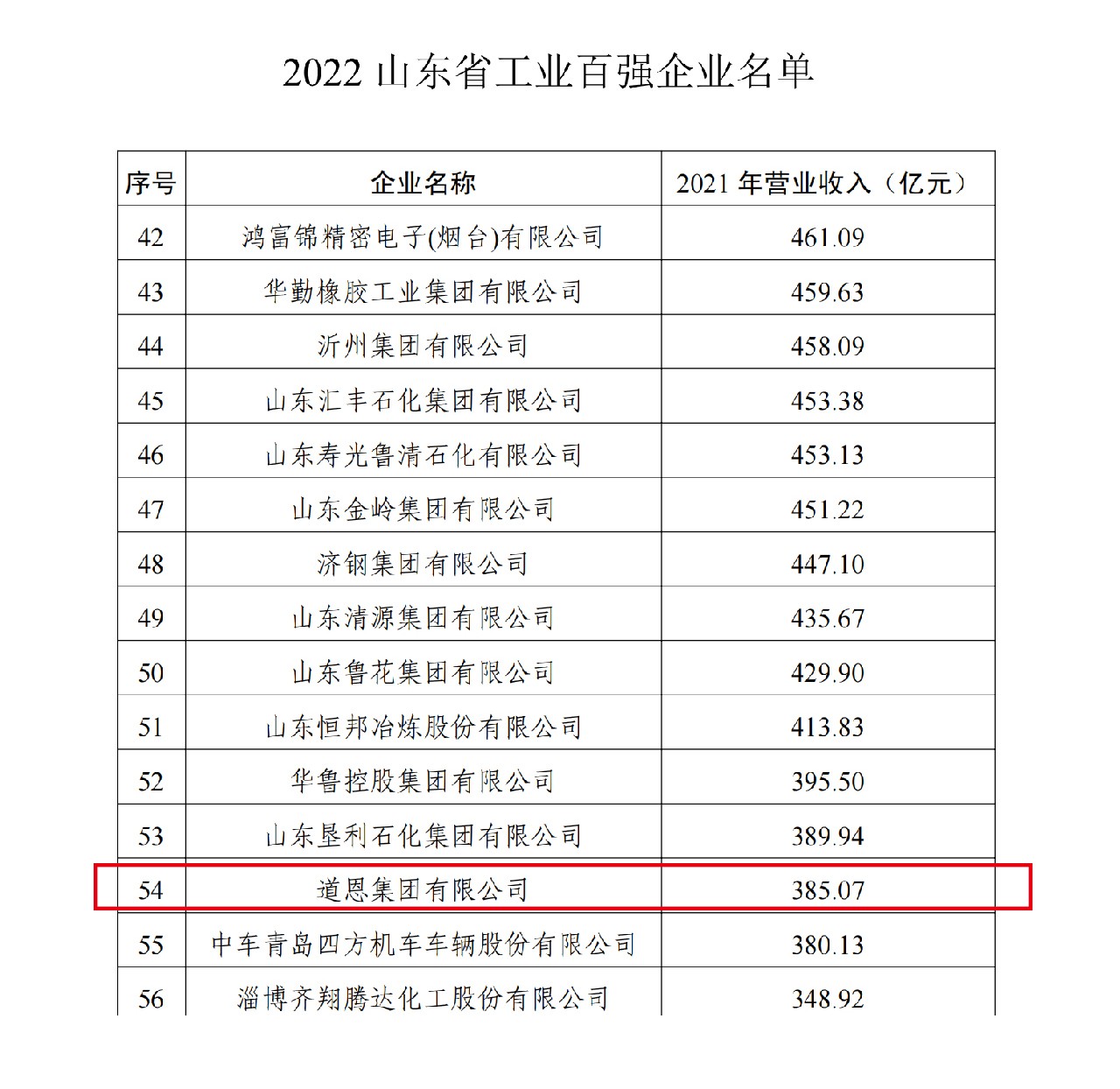 近日,山東省工業和信息化廳、山東省企業聯合會公布2022山東企業百強名單,道恩集團入選綜合百強企業第70名和工業百強企業第54名。