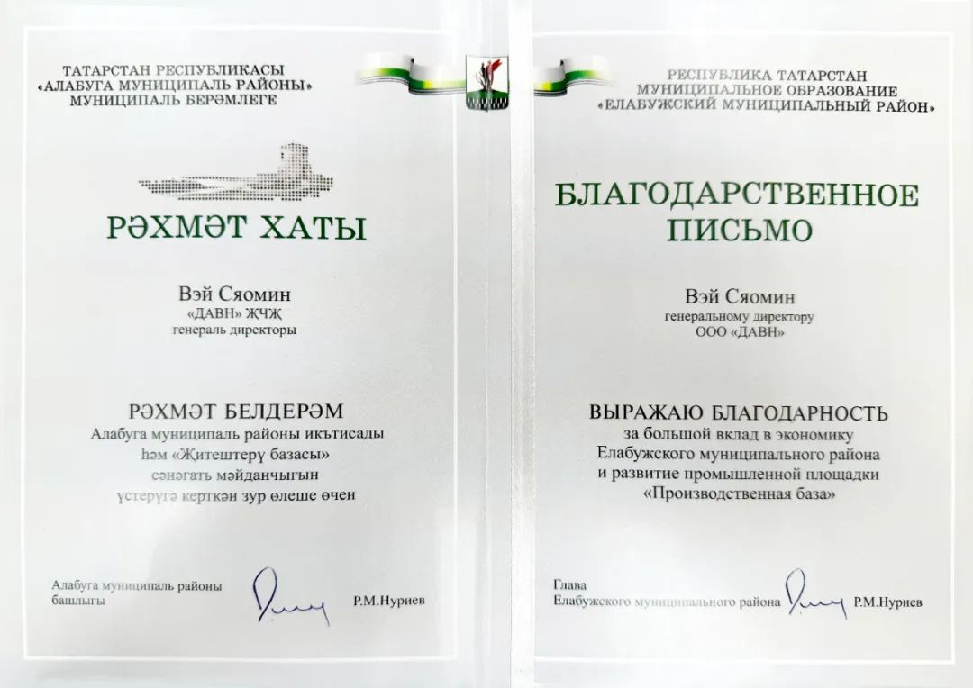 “感謝貴公司為葉拉布加市及葉拉布加工業區的經濟發展和進步作出了重大貢獻。”10月24日,在韃靼斯坦共和國葉拉布加市舉行的年度經濟發展交流會上,該市市長盧列夫·魯斯塔姆為道恩英德爾有限責任公司頒發的致謝信,如是評價道恩在俄羅斯工廠突出的表現。